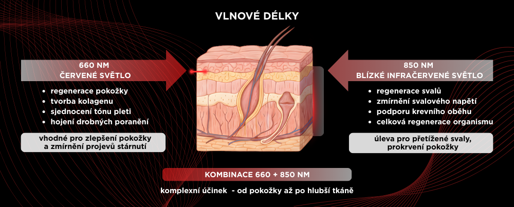 Světlo o vlnových délkách 660 a 850 nm proniká do vrstev pokožky, svalů a hlubších tkání, kde podporuje buněčnou aktivitu, zlepšuje prokrvení a přispívá k přirozeným regeneračním procesům. Zároveň podporuje tvorbu kolagenu, čímž přispívá ke zdravějšímu vzhledu pokožky a lepší elasticitě.